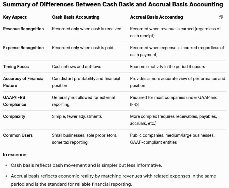 2. Accrual basis follows the matching principle (revenues matched with the expenses incurred to generate them) and is considered the more accurate method for assessing long-term profitability and financial position, which is why it is mandated for most external financial statements.