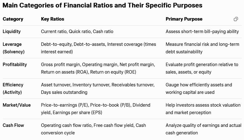 2. Financial Health and Risk Assessment: they reveal the company’s solvency (ability to meet long-term obligations), liquidity (ability to meet short-term obligations), and overall financial stability. Creditors and bond rating agencies rely heavily on these ratios when deciding whether to extend credit or at what interest rate.